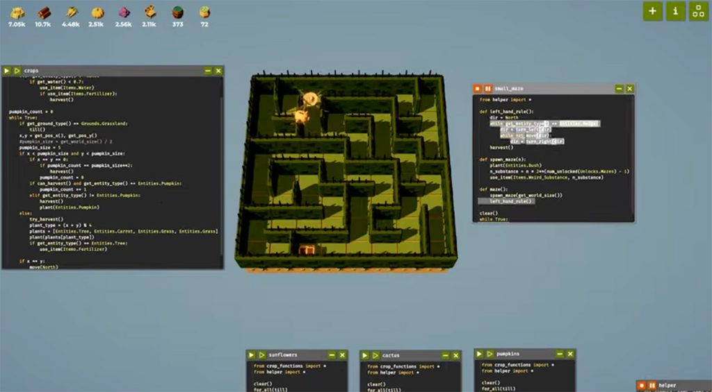 初心者にとって嬉しいポイントは、最初から難しいプログラムを書かされるわけではない点です。収穫などの単純作業から始め、資源を集めることで「While」ループや「If」条件分岐、さらに関数(Function)といったプログラミングの核となる概念を、段階的にアンロックしていきます。