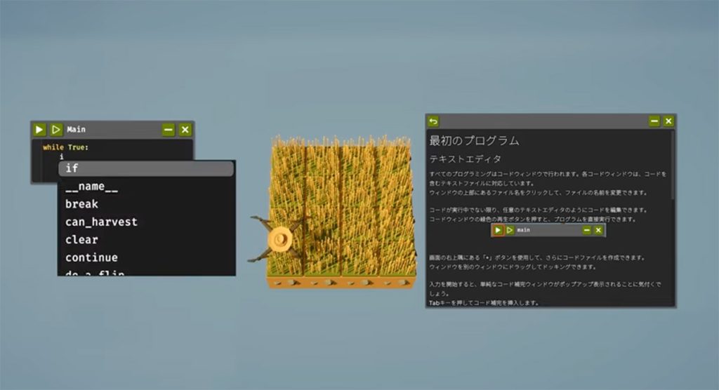 プレイヤーはドローンに「コード」という名の設計図を与え、それが実際に農場で動き出すのを眺めることになります。この「書く」→「動かす」→「最適化する」というシンプルなループが、コーディング学習における最も楽しく、そして効率的なプロセスとなるのです。